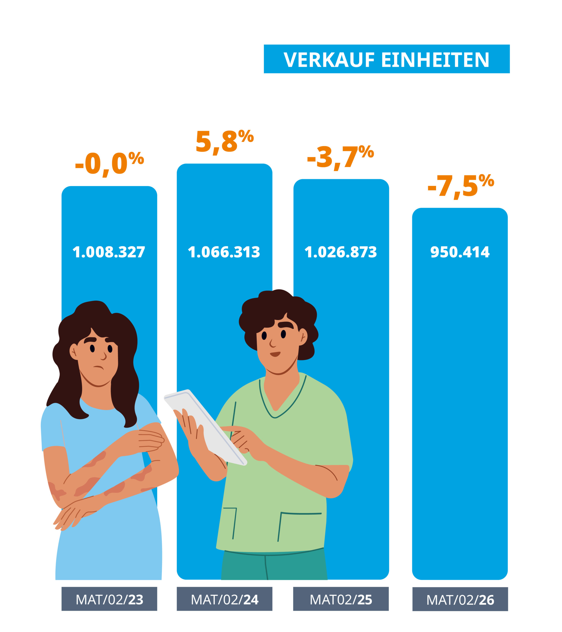 Der Absatz von Mittel gegen Hautpilz (über die letzten 4 MAT´s) konnte von 2023 auf 2024 um 5,8 % gesteigert werden. Von 2024 auf 2025 gab es Rückgang von -3,7 %. 2026 sank der Absatz um weitere 7,5 %.