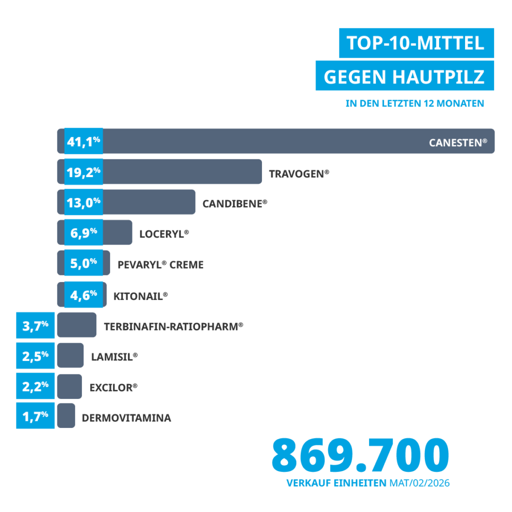 (Quelle: IQVIA PharmaTrend MAT 02/2026, Absatz in Einheiten absolut, Mittel gegen Hautpilz 06G – OTC)