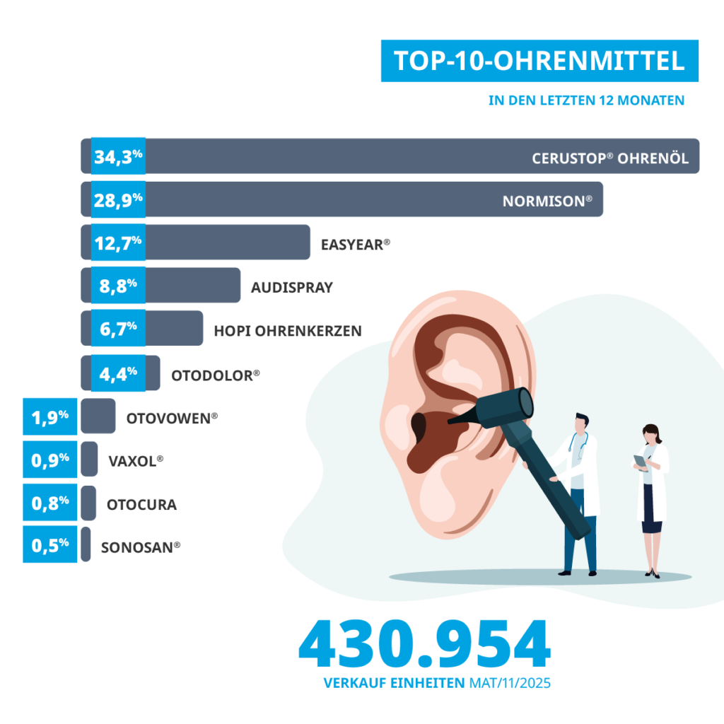 (Quelle: IQVIA PharmaTrend MAT 11/2025, Absatz in Einheiten absolut, Ohrenmittel)
