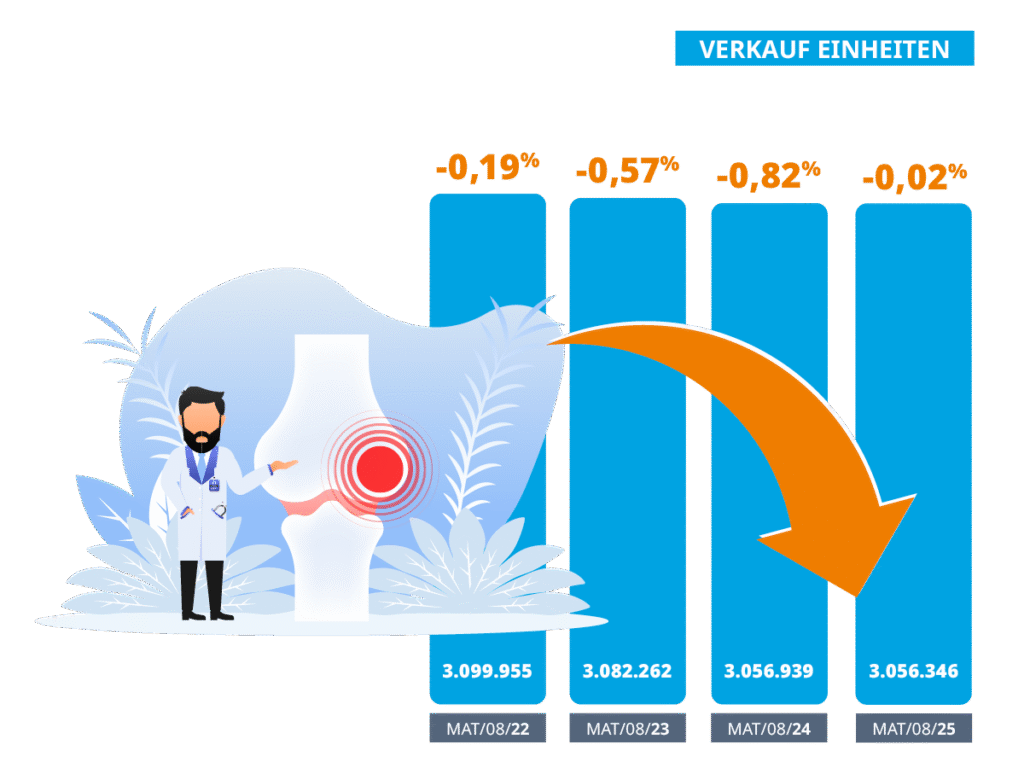 Der Absatz von Schmerz- und Rheumamitteln (über die letzten 4 MAT´s) sank von 2022 auf 2023 um 0,57 %. Von 2023 auf 2024 gab es neuerlichen Rückgang von 0,82 %. Auch 2025 konnte der Absatz im Vergleich zu 2024 nicht gesteigert werden.