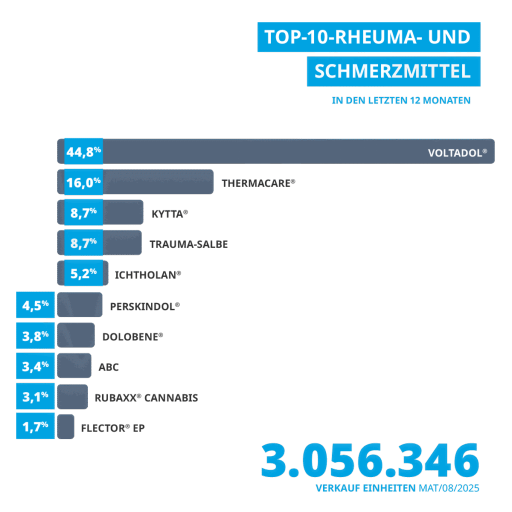 (Quelle: IQVIA PharmaTrend MAT 08/2025, Absatz in Einheiten absolut, Schmerz- und Rheumamittel)