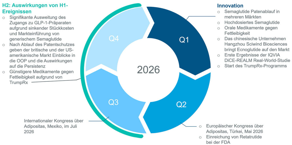 Abbildung 1 gibt einen Überblick über zentrale Ereignisse im Jahr 2026 – darunter geplante Studienveröffentlichungen, regulatorische Entscheidungen und Markteinführungen in wichtigen Märkten.