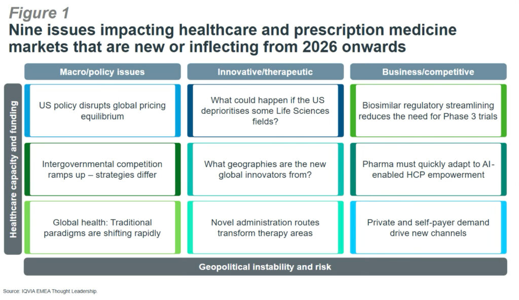 Auch 2026 stehen die Gesundheits- und Life-Sciences-Sektoren vor einem Jahr des Wandels. Globale politische Veränderungen und wissenschaftliche Innovationen gestalten vertrautes Terrain neu, stellen etablierte Normen infrage und eröffnen neue Möglichkeiten. IQVIAs ‚Nine for 2026‘ rückt die Perspektiven des EMEA Thought Leadership Teams zu einigen der bedeutendsten neuen und trendbrechenden Themen in den Fokus, die die Märkte für verschreibungspflichtige Arzneimittel und das globale Gesundheitswesen im Jahr 2026 und darüber hinaus beeinflussen werden.