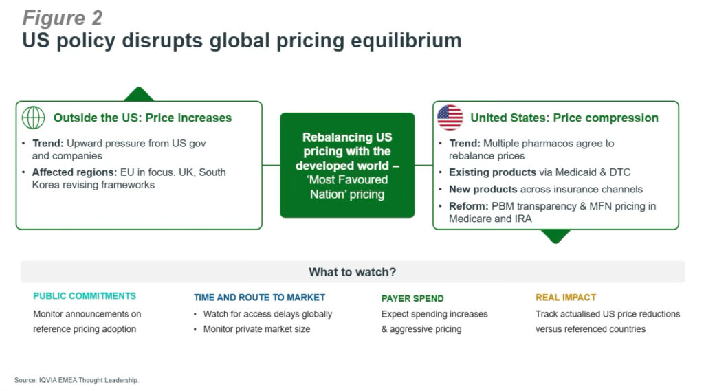 Eine der bedeutendsten politischen Herausforderungen, mit denen die Branche im Jahr 2026 konfrontiert sein wird, ist die Störung der globalen Preisgestaltung und der Ausgabenstrukturen. Sie wird durch die Bemühungen der Vereinigten Staaten vorangetrieben, ein Bündel von Maßnahmen zu testen, das darauf abzielt, die Preise für innovative Arzneimittel für US Patienten zu senken – und dies auszugleichen, indem für ausgewählte Zielländer weltweit höhere Preise und höhere Arzneimittelausgaben angestrebt werden.