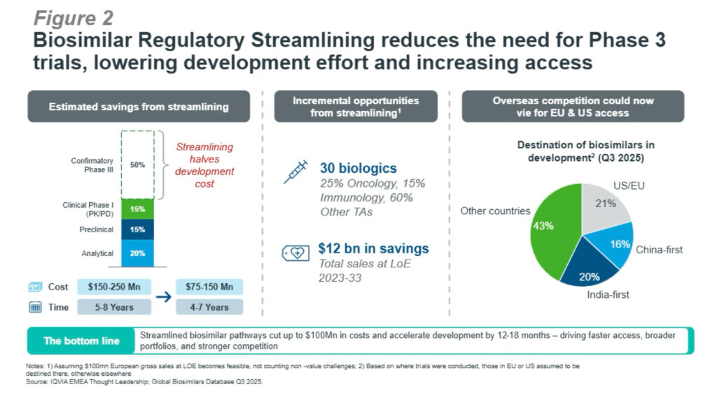 Die globalen Regulierungsbehörden überarbeiten derzeit die Regeln für Biosimilars und der Zeitpunkt könnte nicht kritischer sein (Abbildung 2). Während sich die Branche auf eine Welle von Blockbuster-Biologika einstellt, deren Exklusivität ausläuft (insbesondere in der Onkologie und Immunologie), folgen die EMA und die FDA der MHRA bei der Einführung vereinfachter Zulassungsverfahren. Die Pflicht zur Durchführung bestätigender Phase-3-Studien entfällt, wodurch sich die Entwicklungskosten halbieren. Diese Umstellung könnte bis zu 100 Millionen Dollar einsparen und die Markteinführungszeit um mehr als ein Jahr verkürzen.
