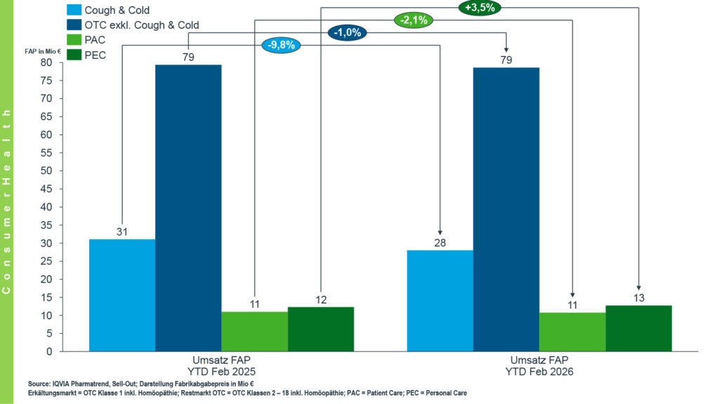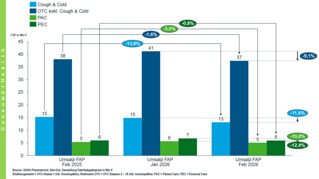 Beim Vergleich des Februar 2025 mit Februar 2026 zeigen sich folgende Entwicklungen des Consumer Health Marktes. Der Erkältungsmarkt sinkt um – 13,9 %, der Over the Counter Markt exkl. Erkältung weist einen leichte Abnahme von – 1,6 % auf. Der Patient Care Markt verzeichnet ein Minus von 5,0 %, während der Personal Care Umsatz um – 0,8 % sinkt.