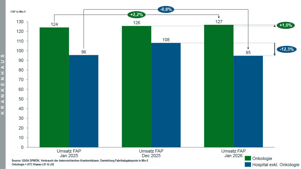 In der Monatsbetrachtung steigt der Umsatz im Jänner 2026 für onkologische Präparate im Krankenhausmarkt um + 2,2 % verglichen mit dem Vorjahresmonat, der Vergleich mit dem Vormonat zeigt eine Umsatzsteigerung von + 1,0 %. Der Krankenhausmarkt exkl. Onkologie zeigt im Jänner 2026 eine Senkung von – 0,8 % gegenüber dem Vorjahresmonat auf und verzeichnet ein Minus von 12,3 % gegenüber dem Vormonat.