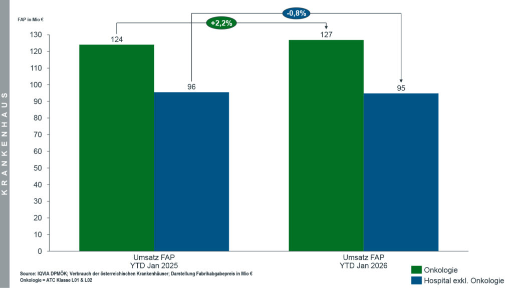 Nachfolgend finden wir eine Betrachtung des österreichischen Krankenhausmarktes. Beim Vergleich von Jänner 2025 mit Jänner 2026 weist der Krankenhausmarkt teilweise ein Wachstum auf. Der Onkologie-Markt entwickelt sich mit  2,2 % positiv, während der Hospitalmarkt ohne Onkologie mit – 0,8 % sinkt.