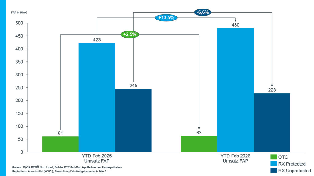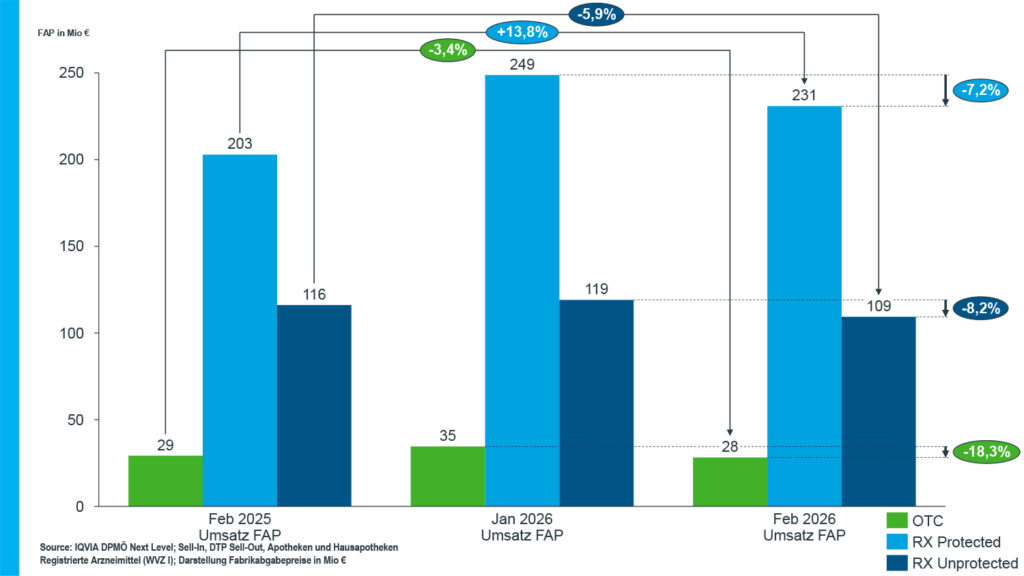 Die Marktentwicklung des vergangen Jahres wird bei den verschreibungspflichtigen Präparaten auch im Monatsvergleich deutlich. Die patentgeschützten Rx Produkte weisen im Februar ein Wachstum von + 13,8 % auf, während ungeschützte um -5,9 % gegenüber dem Vorjahr abnehmen. Von Februar 2025 auf Februar 2026 sinkt der Umsatz der patentgeschützten Rx Produkte um – 7,2 % während die Rx Produkte ohne Patentschutz um – 8,2 % abnehmen. Im Vergleich zum Vorjahresmonat sinkt der registrierte OTC Umsatz um – 3,4 %. Zum Vormonat wird mit – 18,3 % eine negative Entwicklung beobachtet.